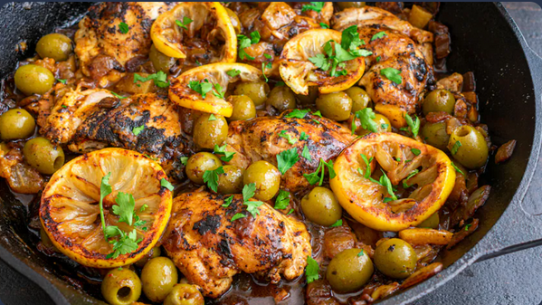 Servez directement dans le tajine, accompagné de pain marocain. Disposez les olives et les quartiers de citron confit au-dessus pour un effet visuel appétissant.